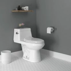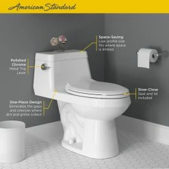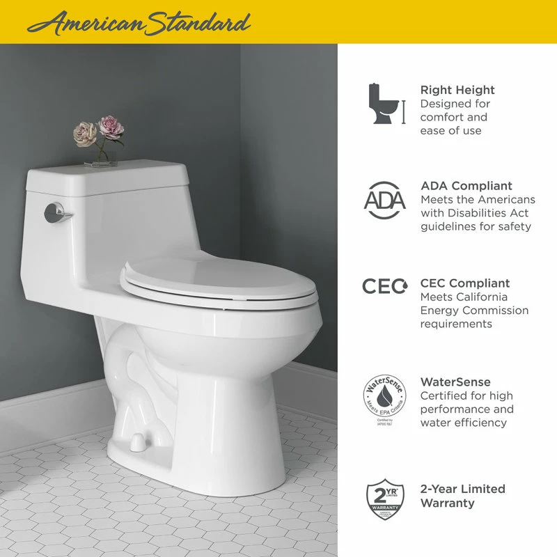 The Colony One-Piece Right-Height Elongated Toilet from American Standard is a compact, low-profile space-saver with a clean, modern look. Thanks to its sleek one-piece design, Colony eliminates the gaps and crevices where dirt and grime collect making it a hygienic, easy-to-clean option for the busiest bathroom. This high-efficiency toilet (HET) uses just 1.28 gallons of water per flush (gpf), saving 20% more water than a standard 1.6 gpf toilet.