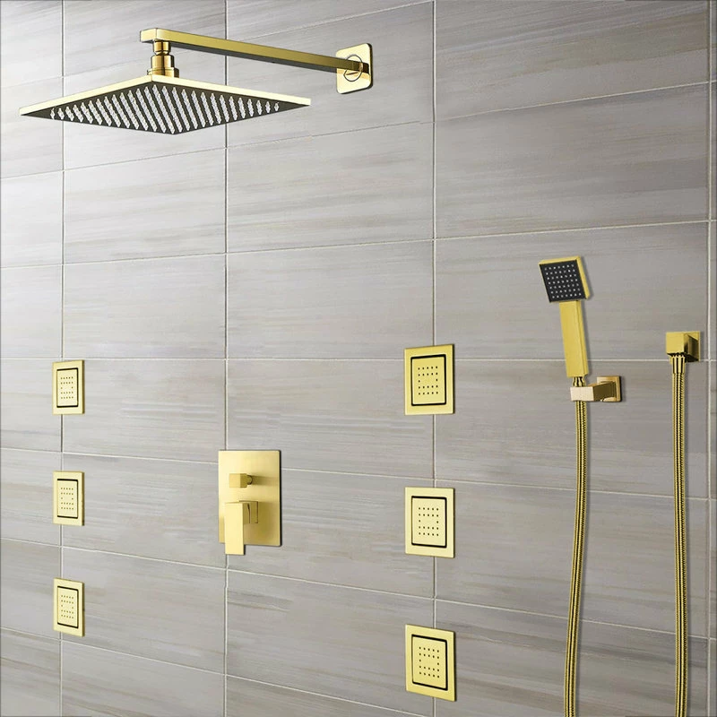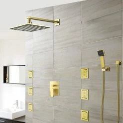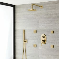 The Ancona Shower Set is a Wall Moun Gold Finish Shower that comes along with 6 Body Shower Jets & Hand Shower. The Ancona Shower Set comes in Gold Finish & have a Cold/Hot Water Mixer. The Ancona Shower Set is Wall Mount & have a Ceramic Valve Core.