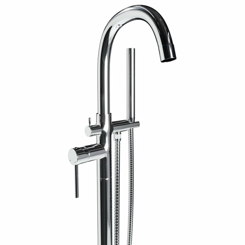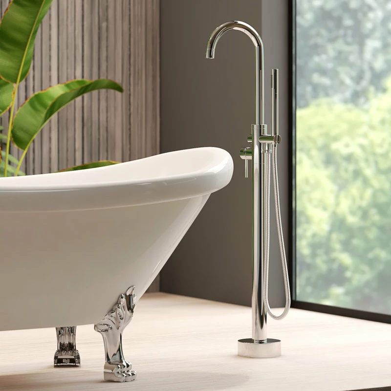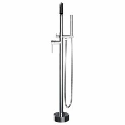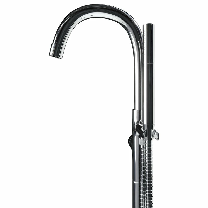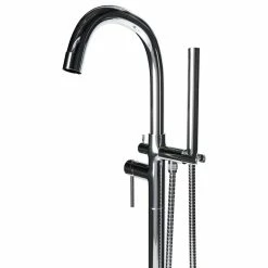 Enhance and complete your new freestanding or clawfoot tub with the beautiful Neptune Floor-Mounted Tub Filler. Constructed from durable solid brass, this tub filler is designed to resist corrosion and stay in prime shape for years to come. The smooth color and defined lines can give a wonderful complement or a striking contrast to your existing tub. The included handheld shower adds significant functionality, allowing you to rinse off yourself, a loved one, a pet, or even the tub itself with ease. The built-in diverter easily switches between the faucet and the handheld shower. A stunning addition to any freestanding bathtub or bathroom space.