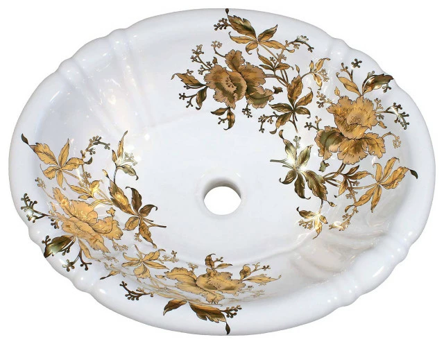 Add an elegant and dramatic statement to your guest bath or powder room. Matte and shiny metallic gold orchids and leaves edged in black painted on a white fluted drop-in basin. All of our fixtures are hand-made to order in the USA and kiln-fired for long-lasting durability. Please note: fixture shown is no longer available. Please see Product Specification Sheet for photo. Essentially the same sink, with three overflow drain holes instead of one.