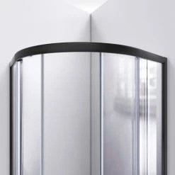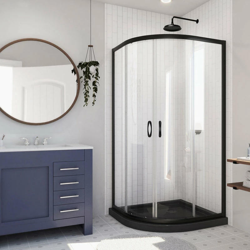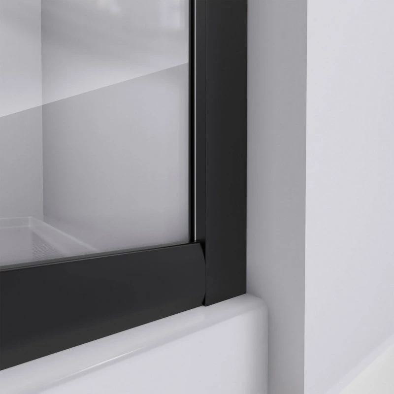 - Anodized aluminum wall profiles allow 1 in. adjustment per side; Glass Type: Clear; Door Hardware Finish: Satin Black; Base Color: Black