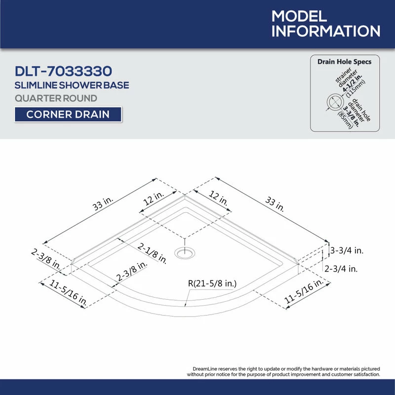- SlimLine Shower Base: Curved neo round design for corner installation; Low profile threshold design; Reinforced with fiberglass