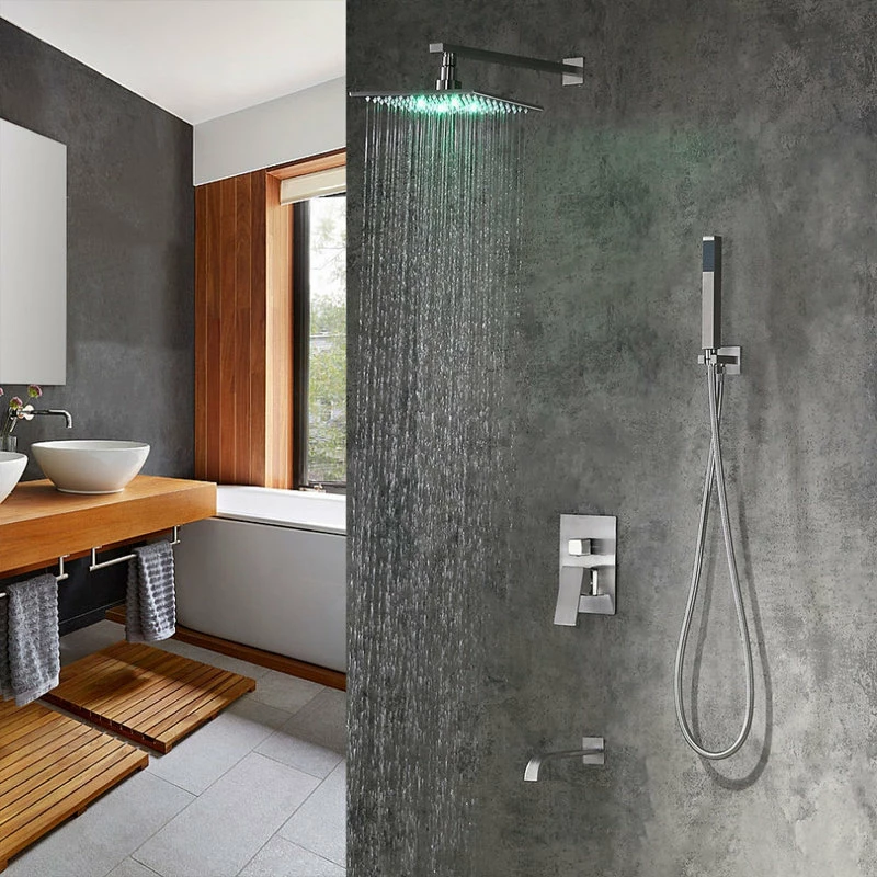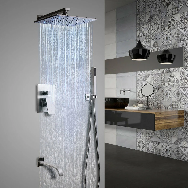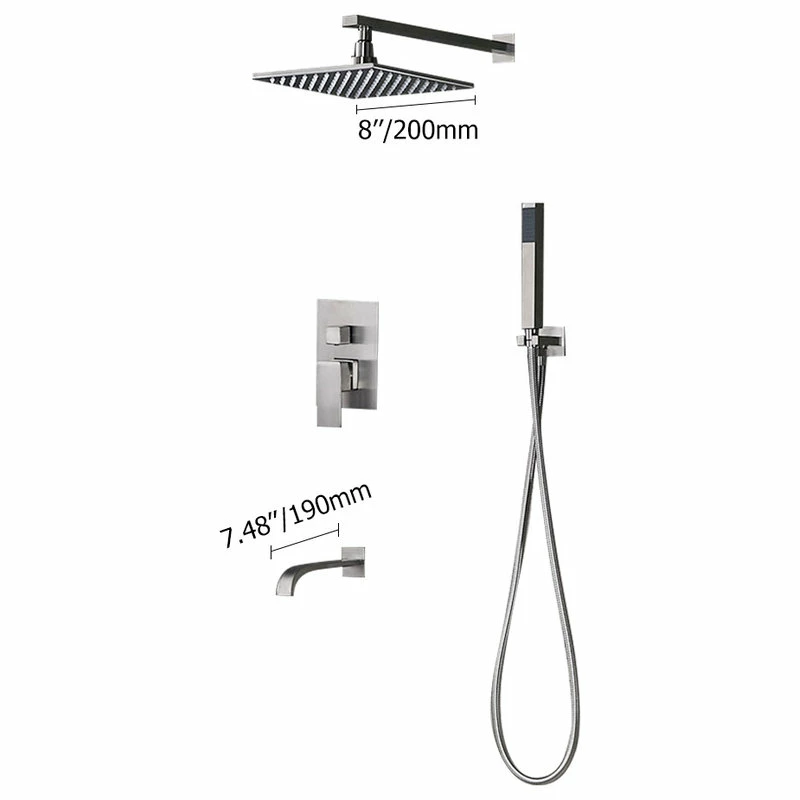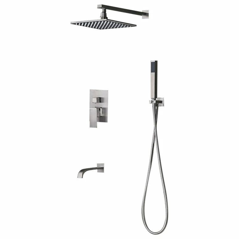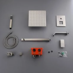 - Includes 10″ (250mm) rain shower head, wall mount shower arm, hand shower parts, a tub spout, 3-function shower valve.