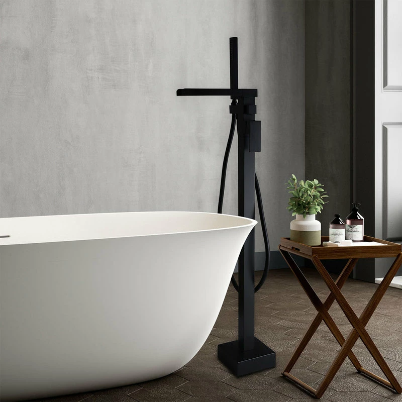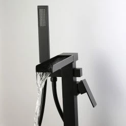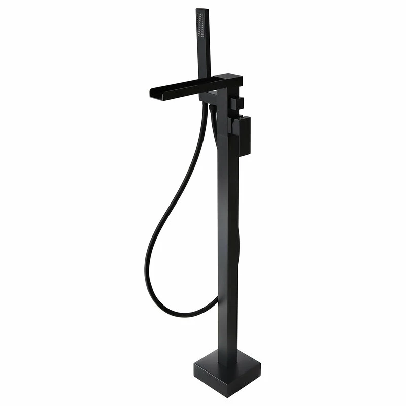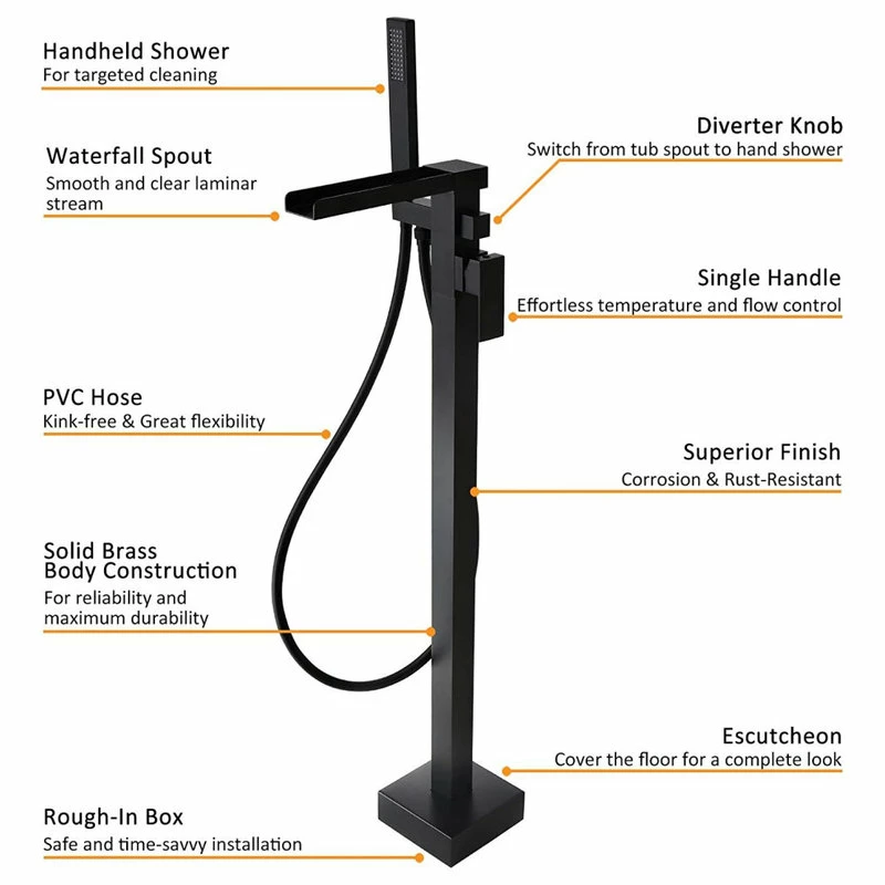 Brilliant and minimalist, this modern freestanding tub filler faucet will be a striking addition to any bathroom. Constructed from lead-free solid brass, this tub faucet is made for safe and long-lasting service. Come with an extended trough-style spout, it creates a soothing waterfall effect when filling your tub quickly for a comfortable soak. A hand shower not only offers targeted spray to every part of your body but also allows for bathing children and washing pets. In matte black, it will maintain the beautiful sheen for years to come and suit your decor flawlessly.