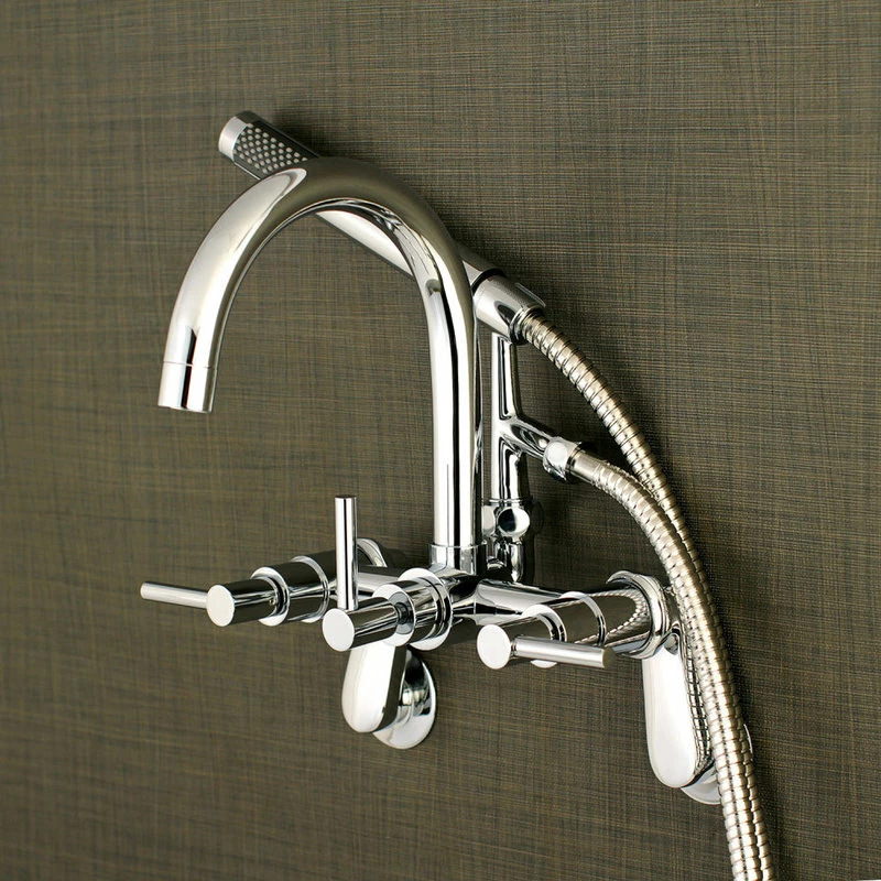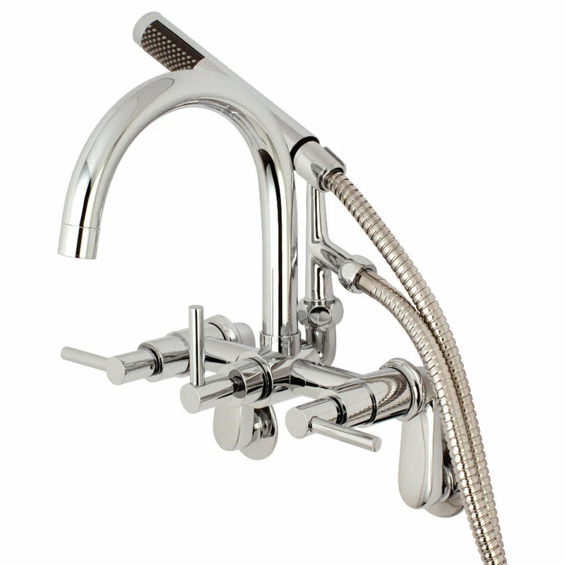 Wall mount clawfoot tub faucets are the perfect fixture to add decorative flair within your bathroom because of their unique architectural elements. With sleek design, this will complete your refined bathroom decorum with the help of its premium polished chrome finish and contemporarily styled handheld shower. The solid brass construction also makes for a heavy, quality made product.