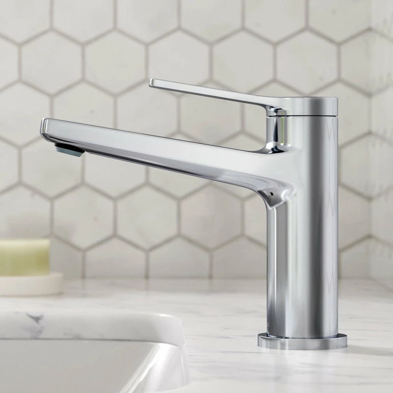 With a streamlined contemporary silhouette, the Indy faucet blends beautifully into any style of bathroom decor. The highly functional design features a slim single lever handle, premium components including a water-saving aerator and leak-free ceramic cartridge, and pre-attached water lines for easy installation.