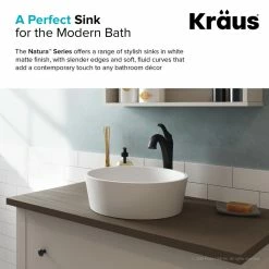 Add a beautiful accent to your bathroom with Natura Series sinks in elegant white matte finish. Contemporary silhouettes with slender edges offer a light, airy, and luminous look, giving your bathroom a fresh new appearance with highly desirable modern appeal. Made from unique mineral composite material, these sinks combine the best of nature and technology to provide unparalleled strength and resistance to impact. For added durability, the non-porous sink surface is enhanced with innovative Nano technology, making it easy to clean and impervious to scratches, stains, and water spots. Above-counter installation works with any countertop, and makes an eye-catching style statement while maximizing space on the bathroom vanity.