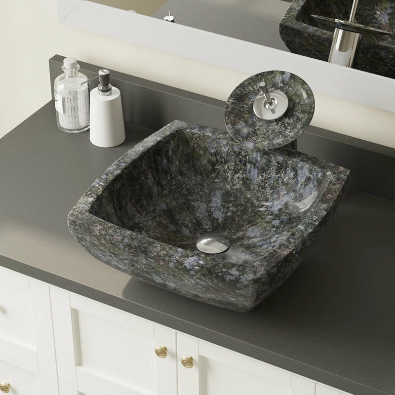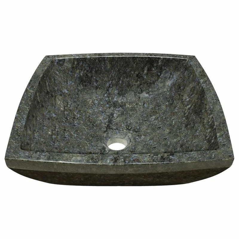 Described as butterfly blue, this black granite features specs of blue mixed with greens, grays, and browns to form a dark and distinctive basin. Although this vessel measures square, its sides gracefully bow slightly outward. Its bold 1″ thickness and hand-polishing reaffirms that it is a solid choice. With an overall measurement of 15 3/4″ x 15 3/4″ x 5 3/4″, it will require a minimum-width cabinet of 18″. This listing does not include any accessories.