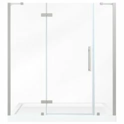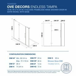 OVE Endless Tampa TA2450250, 72 in. W x 74 3/4 in. H Alcove Frameless Hinge Shower Door in Satin Nickel with Base. The OVE Decors Endless 72 in. Tampa frameless hinge shower door set features a fixed panel hinge system, offering an industrial-inspired look that will complement any space. It comes with premium quality oversized hardware complete with a Satin Nickel finish, and includes a 24 in. wide fixed panel, a 30 in. wide door panel, a 14 in. wide inline panel, ideal for an Alcove installation. All panels are made from Premium 8mm (5/16″) thick certified tempered glass. 72x36x2 3/4 in. Shower base included. The shower base is made of Premium fiberglass reinforced Acrylic. The anti-slip white acrylic base is sturdy and easy to clean, fitting perfectly to your required dimensions.
