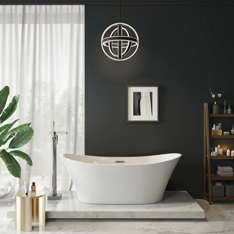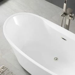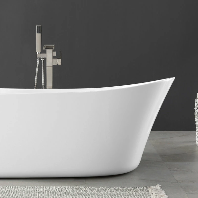 Stretch out and enjoy the generous soaking capacity and cushy leg room of the Jacky 69-inch long freestanding slipper bathtub by OVE Decors. Holding over 60 gallons of water, with lightweight high gloss white seamless acrylic construction that keeps your bubble baths comfortably warm, the Jacky features gently sloped backrests on either end perfect for kicking back and relaxing. A side mount satin nickel pop-up drain empties the tub quickly, while hidden self-levelling feet easily accommodate uneven floors.