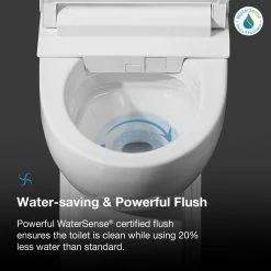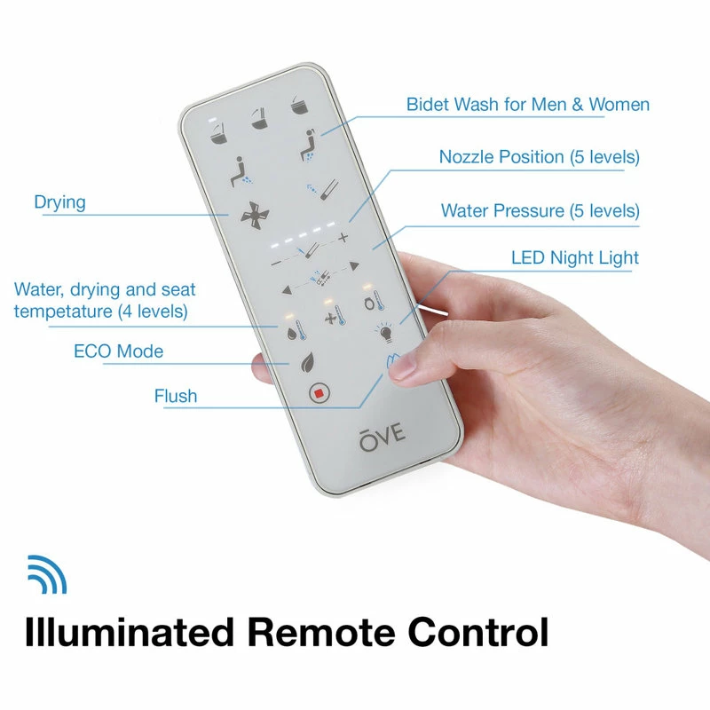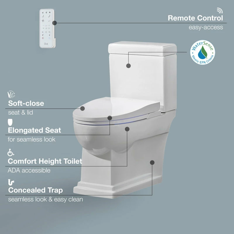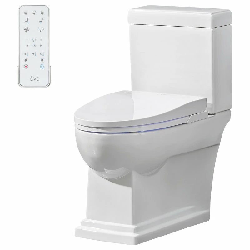 Streamlined elegance and futuristic comforts meet in the Nova elongated bidet toilet by OVE Decors. With its fully customizable water temperature, pressure and bidet wash settings easily accessible by an intuitive remote control, pampering air drying and deodorizing, and self-cleaning functions before and after every use, the Nova will transform your bathroom into a modern oasis. A heated antimicrobial seat that noiselessly opens and closes when it senses your presence plus a soothing night light and powerful 1.27 gallon single auto flush completes the hands-free experience. All in a compact white design with concealed trapway for a sleek and seamless contemporary look.