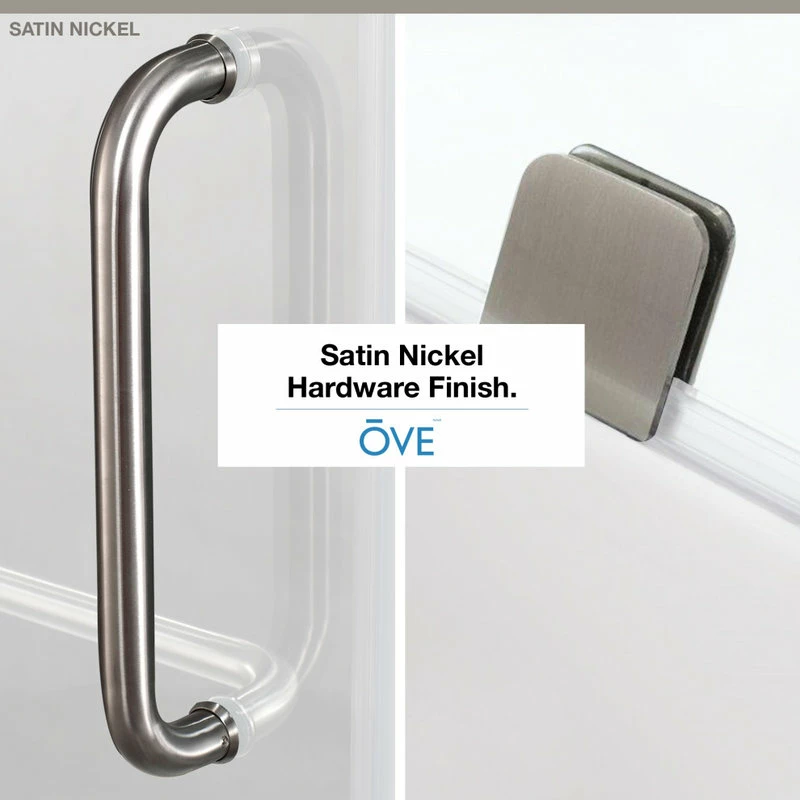 - Satin nickel cross handles on door, and oversized handles in fixed side panel