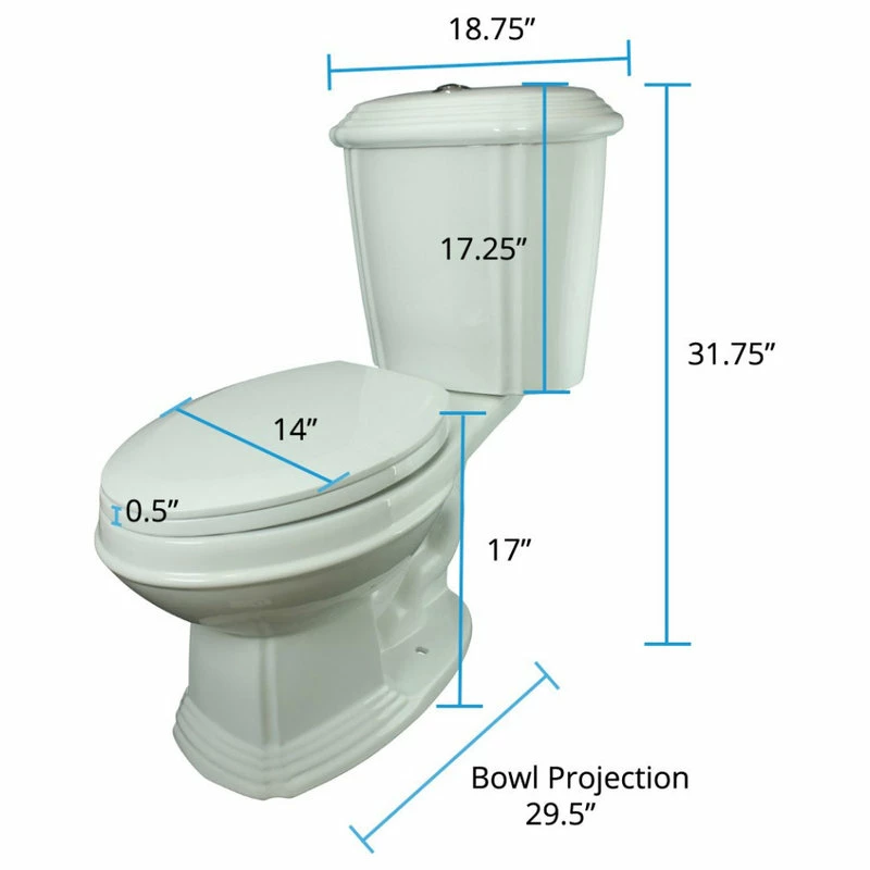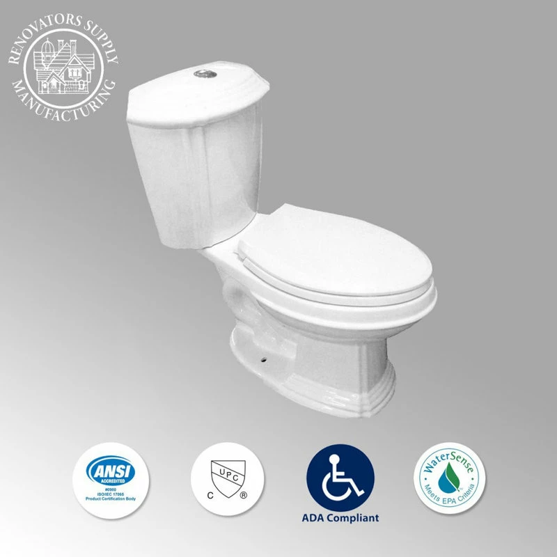 This elegant ADA, cUPC, ANSI, and Watersense Compliant white Elongated seated toilet from The Renovators Supply Manufacturing is a well-designed and valuable fixture for your bathroom. Renovators Supply toilets meet and surpass EPA water conservation guidelines.