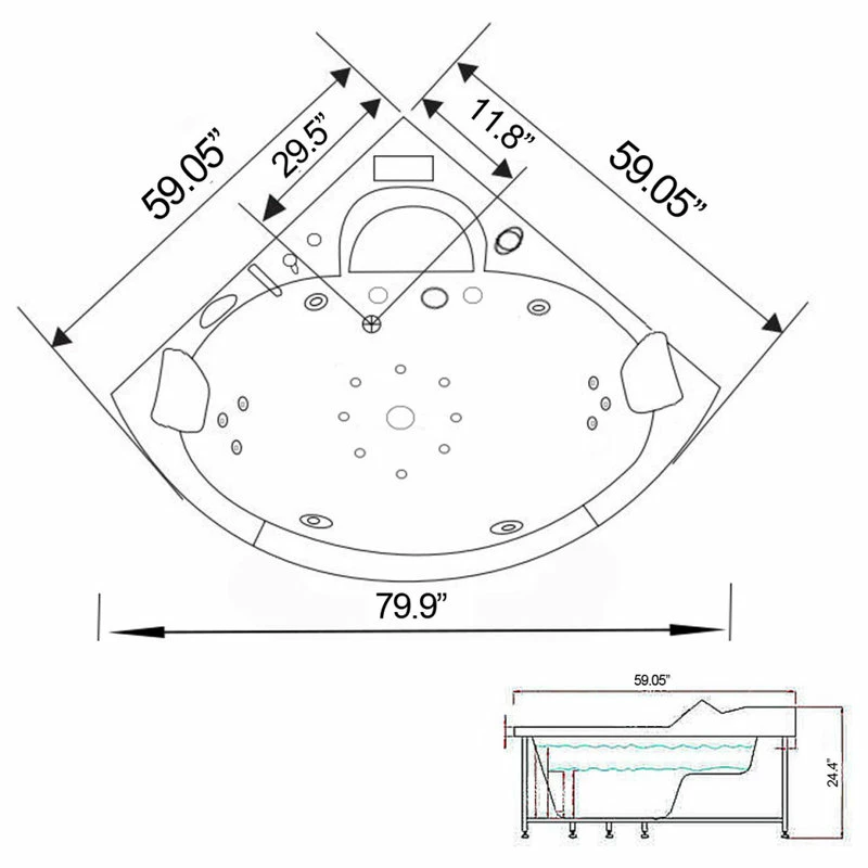 - Bath tub size: base 59,05″ L x 59,05″ W x 26″ High