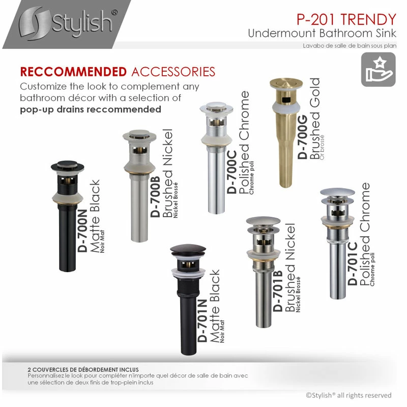 - Standard 1.75″ drain opening works with pull-up & pop-up drains with overflow (1.25″ – 1.5″)