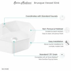 The Brusque Vessel sink is an extremely durable, polished, and non-porous sink, making it not only aesthetically pleasing, but also very practical for long term use. Its scratch resistant and solid, durable ceramic makes this sink stain-resistant and easy to clean. The high-gloss finish gives the sink a modern sleek feel and is available with multiple color options, making it versatile and adaptable. Additionally, this vessel sink is compatible with all Swiss Madison non-overflow pop-up drains and is easy to maintain and clean.
