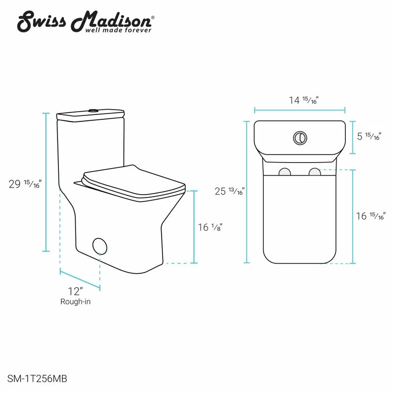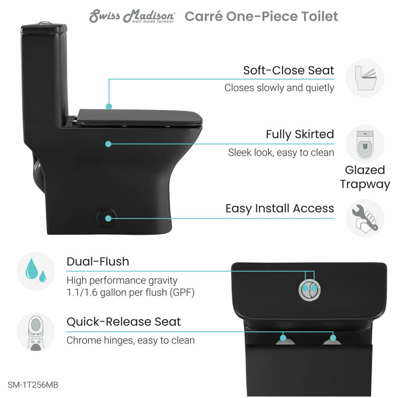 The Carrรฉ Matte Black One-piece Toilet possesses clean lines and fluid curves. Elegance is added to any bathroom given its graceful design, while the square bowl offers improved comfort. The eco-friendly dual flush will save significant amounts of water annually. When paired with our other fixtures from our Carrรฉ Matte Black collection a cohesive and highly personalized bathroom can be created.