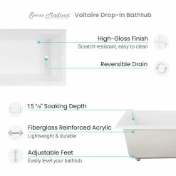The Voltaire Reversible Drain Drop-in bathtub was designed to accommodate any bathroom setting. Its deep soaking depth, lumbar support and smooth floor makes this tub perfect for long, relaxing baths. This tub has an open front and interchangeable installation to allow for a custom fit.