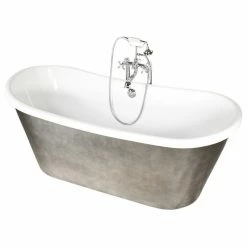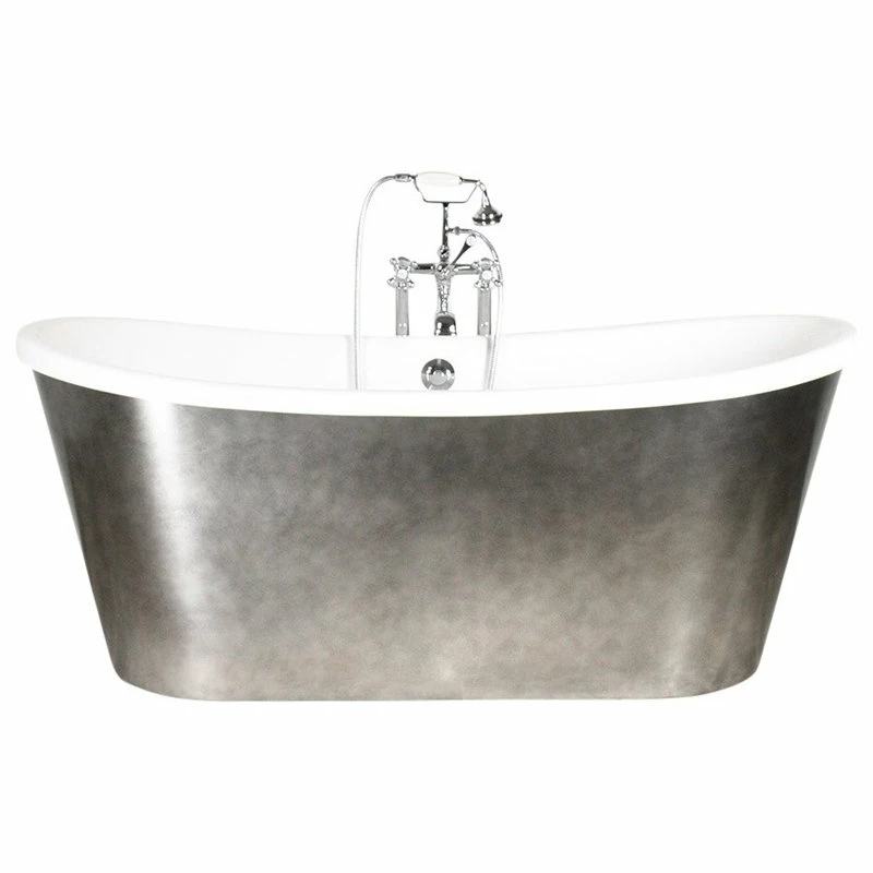 This beautiful skirted tub is made even more elegant when finished in aged chrome, giving it a distinctively worn metal exterior appearance. This is not a glitzy tub and in fact the exterior finish is relatively subdued and subtle. While the exterior definitely looks like metal, it shows what appears to be the effects of natural aging on the surface.
