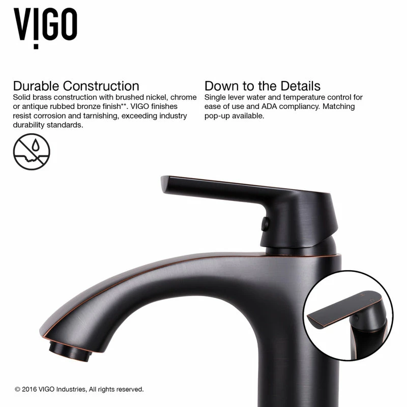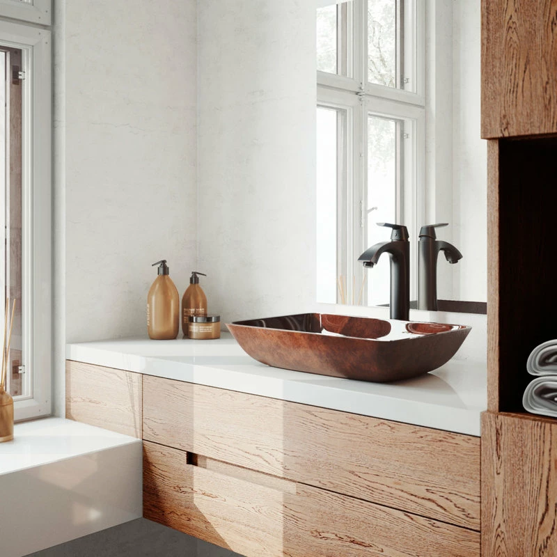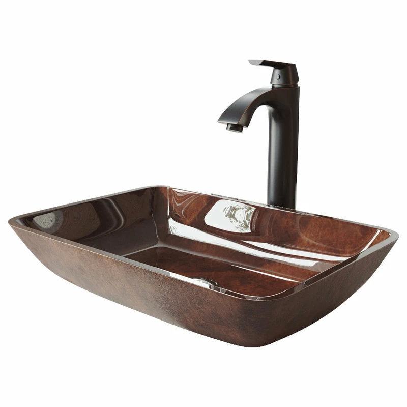 Solid, durable tempered glass finished in rich russet makes the VIGO 18″ Rectangular Russet Glass Vessel Bathroom Sink as strong as it is stunning. This handmade rectangular vessel bowl bathroom sink is built to be a long-lasting statement piece in your home. This set includes the VIGO Linus Vessel Bathroom Faucet in antique rubbed bronze, as well as matching pop-up drain and optional mounting ring.