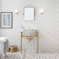The compelling design of this Carrara white marble console sink with solid brass stand sparkles both contemporary and traditional thoughts suitable for any applications. A shiny bar across the front of deluxe, substantial brass legs not only improves stability but also provides a location from which is perfect for hanging towels and washcloths. This stand combines the multiple finishes of the metal structure to durable materials and compact dimensions, features that make it a great fit for a sophisticated bathroom.