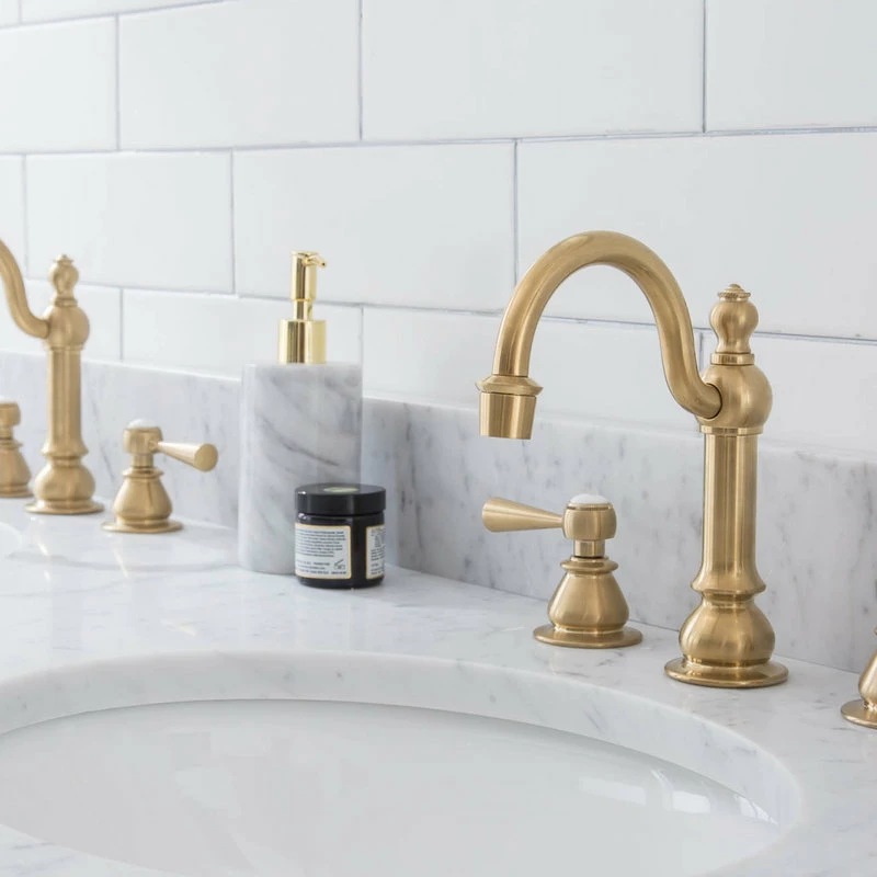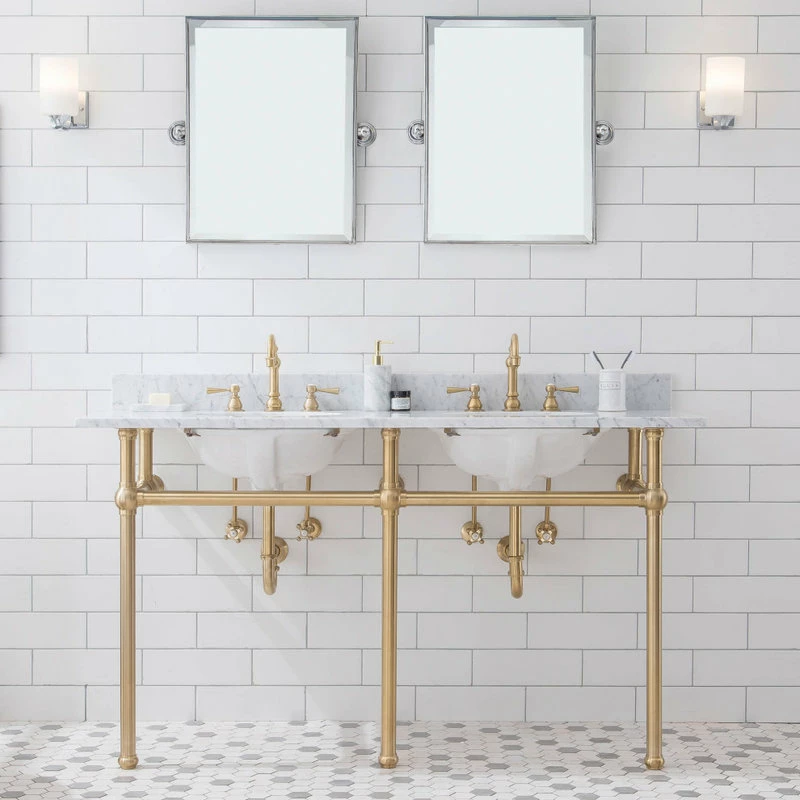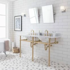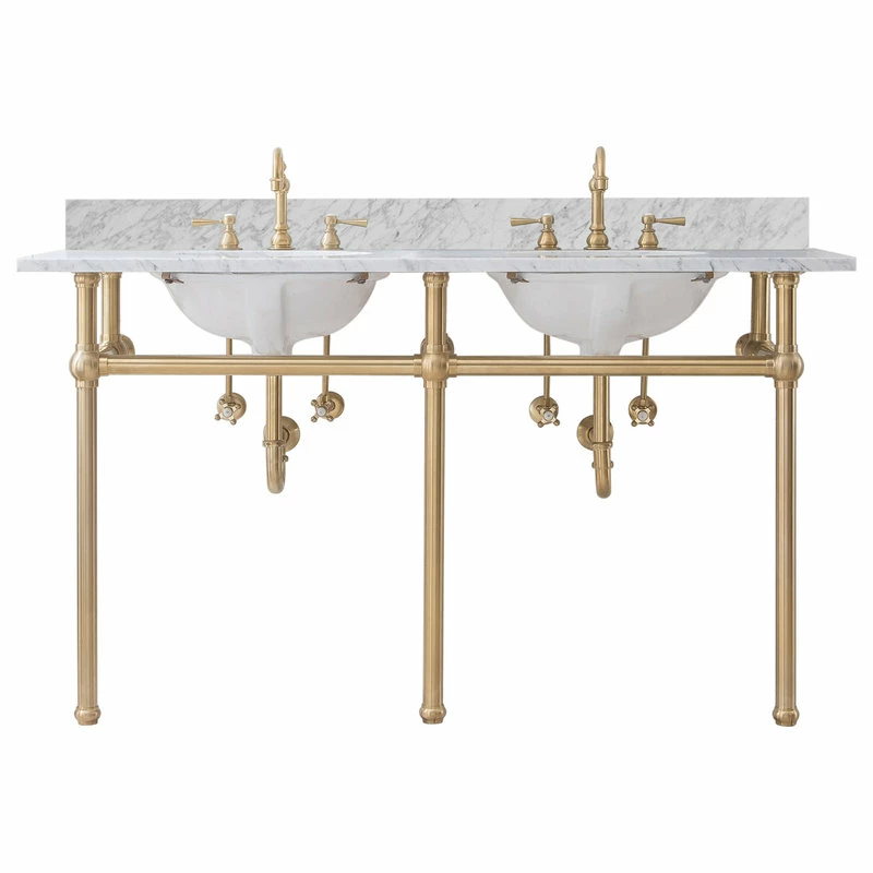 The compelling design of this Carrara white marble console sink with solid brass stand sparkles both contemporary and traditional thoughts suitable for any applications. A shiny bar across the front of deluxe, substantial brass legs not only improves stability but also provides a location from which is perfect for hanging towels and washcloths. This stand combines the multiple finishes of the metal structure to durable materials and compact dimensions, features that make it a great fit for a sophisticated bathroom.